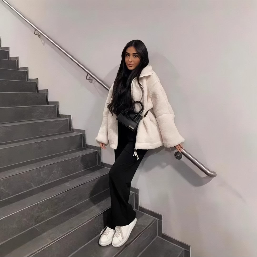 Abbraccia l'inverno senza rinunciare al tuo stile con la nostra Giacca Oversize in Teddy Effetto Sherpa.