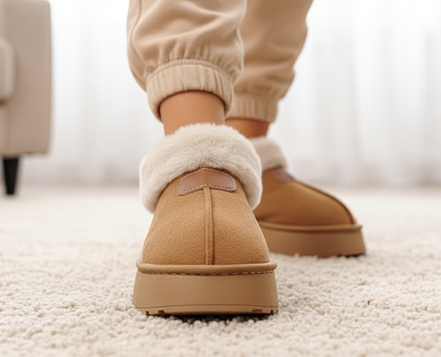 L'esterno in morbido suede color tortora o beige si fonde con il lussuoso risvolto in pelliccia ecologica color panna, avvolgendo i tuoi piedi in un abbraccio di calore. Dimentica i piedi freddi!